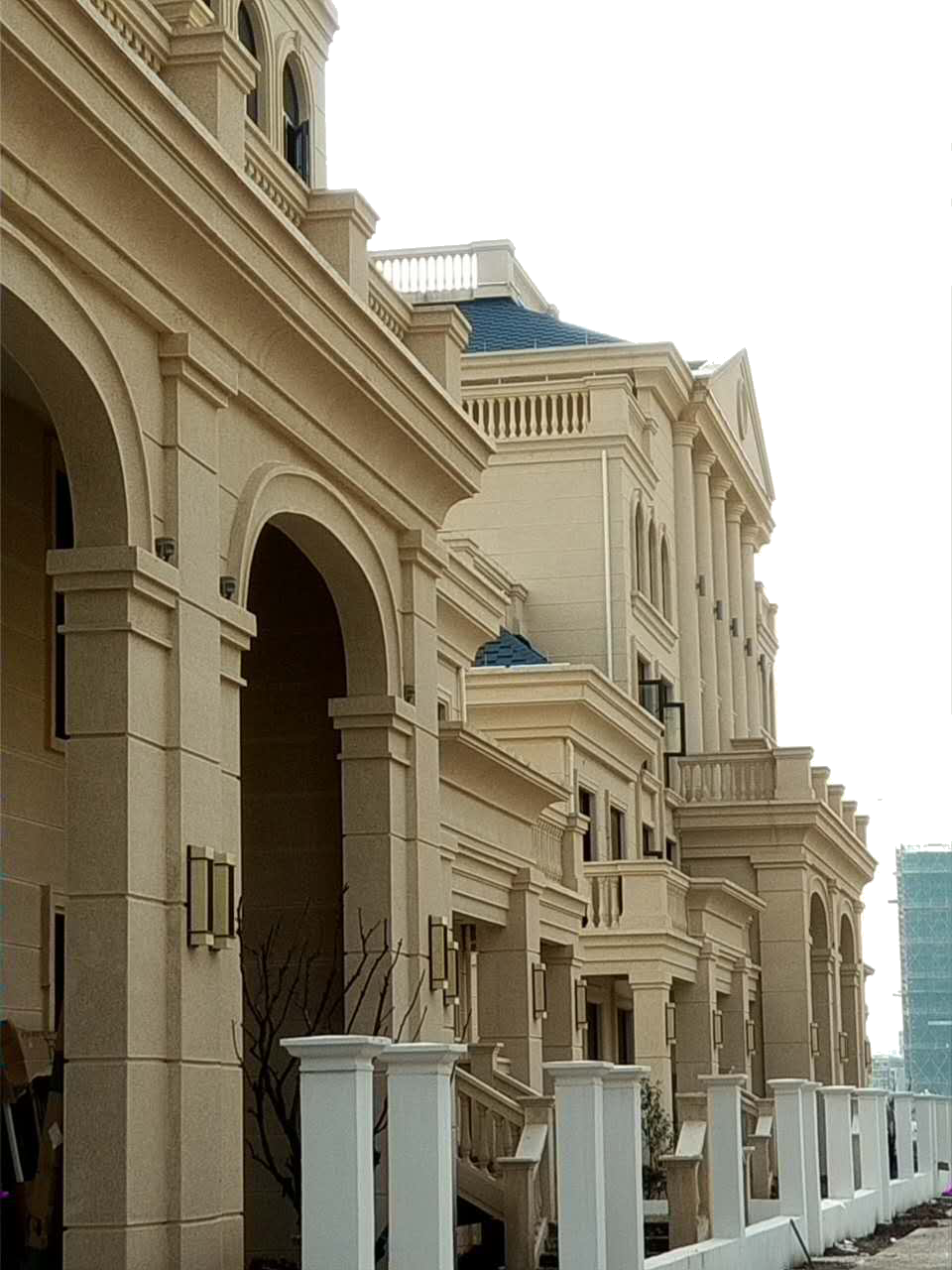 線條安裝采用后錨固的工法,同時(shí),線條安裝過程中會(huì)存在碰壞、破損等現(xiàn)象,且因?yàn)椴糠帜_手架的阻擋而切割局部線條,這樣就需要對破損或被切割的線條進(jìn)行修補(bǔ)。破損或被切割較大的部位,須先清理待修部位,并用EPS板材切割成與缺損部位相同體積和形狀的EPS材料,用專用粘結(jié)劑粘貼到位,表面再覆蓋抹面砂漿和耐堿網(wǎng)格布,并搭接到周邊50mm以上。Z終完成面須與周邊大面形成一個(gè)整體,確保平整、光順。