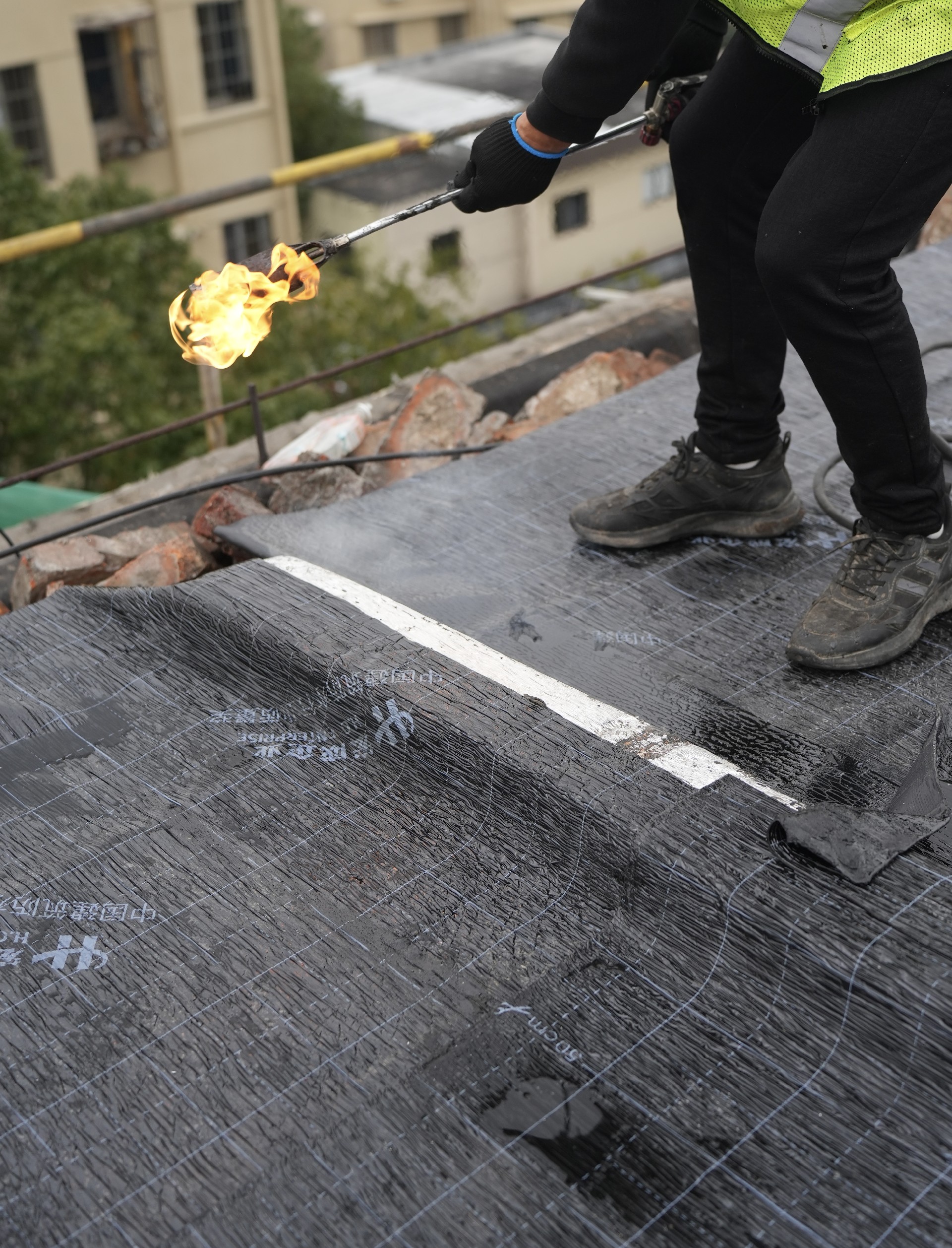 2. 加熱:噴槍火焰對準(zhǔn)卷材粘結(jié)面與基層(角度30°~45°),均勻加熱至瀝青熔融發(fā)亮(約1~2秒);